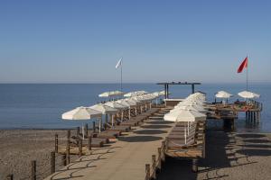 Отель имеет достаточно большую ухоженную территорию,зеленую и чистую. По территории можно найти кафешки,ресторанчики и бары. Очень удобный бар у моря,там можно взять любые фрукты,которых в изобилии на любой вкус и заказать вкусные коктейли,отсканировав qr-код меню. Отдыхали в августе,фруктов было очень много.всегда свежие,всегда доносят и докладывают. С лежаками проблем нет ,вроде бы основная масса всегда заняты,но все равно место можно найти всегда. Удобно расположены места для хранения полотенец,души на пляже,туалеты,которые постоянно моют и убирают. Есть бассейн 16 и зона на пляже,для отдыхающих без детей. По вечерам в этой зоне(у бассейна) проводят отличные концерты.также есть концерты в амфитеатре для детей и взрослых. В отеле неплохой детский клуб с различными активностями. В основном ресторане всегда хорошая еда,много рыбы такой,как лосось,сибас,Дорадо и другие,всегда есть говядина в разных видах. Морепродукты,роллы,суши,раки-каждый день. Удивило то,что все рестораны Аля карт-платные,что странно для Турции. На ресепшене есть прекрасная кофейня с десертами. Хорошее спа. В целом отдыхом мы остались довольны,жили в основном здании,в правой части,над рестораном. Из минусов:кошки,их очень много,они лазят по столам ,могут запрыгнуть сзади,когда вы этого не ожидаете,это неприятно. Все-таки в ресторанах должна соблюдаться санитария,а уличные животные,это точно не подходящий нюанс. Далее,номерная база..за это хотела даже снизить звезду. Номерам нужен ремонт,они старые,не очень удобные. Много чего нужного нет,например доски гладильной и утюга. Попросили ,принесли старую ржавую доску и утюг,для отеля 5 звезд и за такую стоимость отдыха,это недопустимо. На ресепшене тоже пора обновить некоторые диванчики и кресла. Много грязных и даже с дырками. Ну и пора уже прекратить встречать гостей ,предлагая им «Yupee»,другими словами не химическими напитками с красителями,я не думаю,что предложить сок либо натуральный лимонад или воду очень затратно. Персонал доброжелательный,отзывчивый и вежливый. Рекомендую также заказывать индивидуальный трансфер до аэропорта.