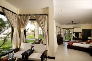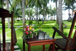 На шести с половиной гектар кокосовой рощи у кромки пляжа залива Муйне комфортно разместились, не мешая друг другу, три пятиэтажных корпуса, двенадцать вилл, два ресторана, два бара, конференц-холл, два бассейна, фитнес-центр, и спа-комплекс под открытым небом, магазины, библиотека и игровая площадка для детей.
